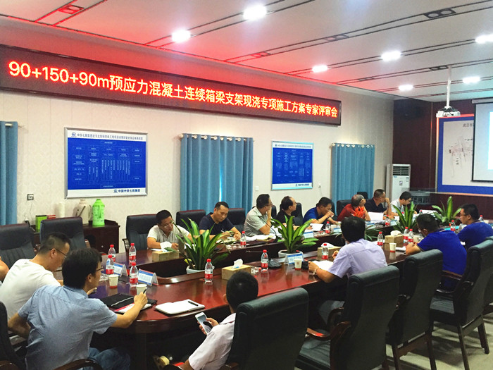 2018年8月24日,北四環(huán)公司組織召開90m+150m+90m(3.2萬噸)轉(zhuǎn)體連續(xù)梁支架現(xiàn)澆專項施工方案專家評審會。會議邀請了五名業(yè)內(nèi)資深專家把關(guān)。各相關(guān)參建單位代表出席了本次會議。與會人員聽取了武漢北四環(huán)跨鐵工程項目部人員匯報并發(fā)表了有關(guān)意見后,經(jīng)過專家組及相關(guān)單位代表認真細致討論,一致認為該方案總體可行,同時也提出了一些局部需修訂完善的意見和建議。