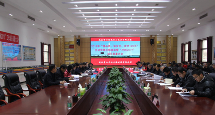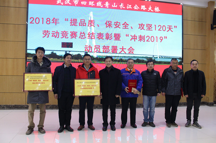 2019年1月18日下午,青山橋公司在天興洲會(huì)議室隆重召開(kāi)2018年“提品質(zhì)、保安全、攻堅(jiān)120天”勞動(dòng)競(jìng)賽總結(jié)表彰暨“沖刺2019”工作動(dòng)員部署大會(huì)。武漢交投集團(tuán)總經(jīng)理、青山橋公司董事長(zhǎng)陳順平,大橋局副局長(zhǎng)張春新及各參建單位領(lǐng)導(dǎo)出席會(huì)議。